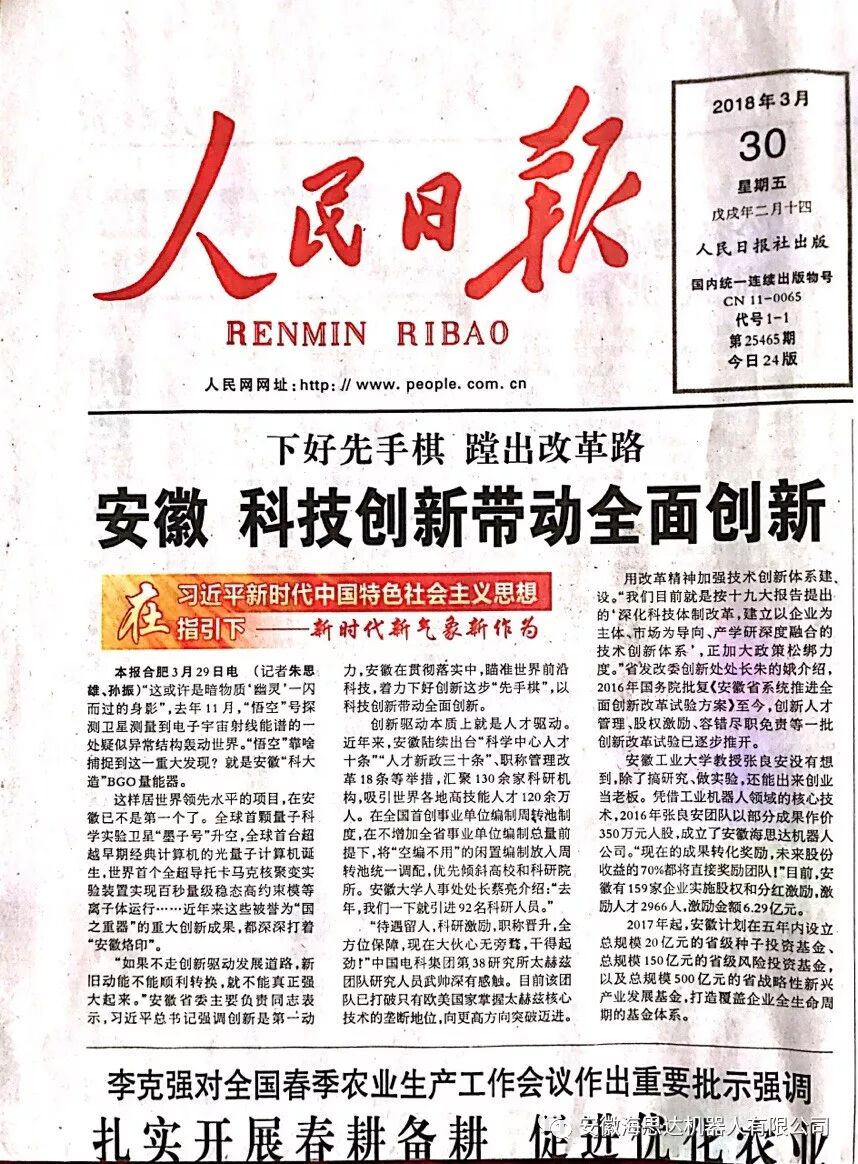 2018年3月30日,安徽海思达机器人有限公司荣登人民日报头版头条!