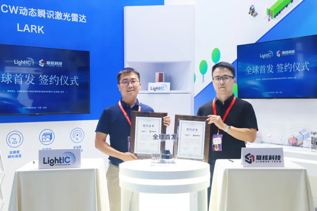 2025年6月4日,杭州大会展中心8号馆摩尔芯光#8-056展位,联核科技CEO徐昺与摩尔芯光联合创始人兼CEO孙杰共同签署战略合作协议。徐昺表示:“此次合作是联核科技在工业机器人感知技术领域的重要布局,FMCW激光雷达的加入将大幅提升工业移动机器人在复杂动态环境中的适应能力。”孙杰则强调:“摩尔芯光将持续深化与联核科技的技术融合,共同推动FMCW激光雷达在工业领域的规模化应用。”