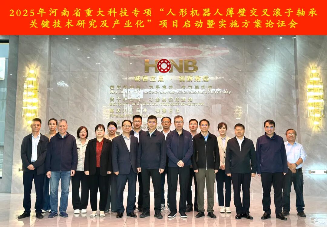 2025年9月28日上午,由洛阳鸿元轴承科技有限公司牵头申报的河南省重大科技专项“人形机器人薄壁交叉滚子轴承关键技术研究及产业化”项目启动暨实施方案论证会在鸿元轴承研发楼召开。省科技厅二级巡视员曹贵金、先进制造处二级调研员韦永军,鸿元轴承董事长周树洲,市科技局党组成员、一级调研员陈宏,河南科技大学副校长吴庆涛,洛阳理工学院副校长上官林建,中国轴协专家委员会副秘书长、省机械工程学会监事长马伟等领导、行业专家及项目参研单位代表共20余人参会。