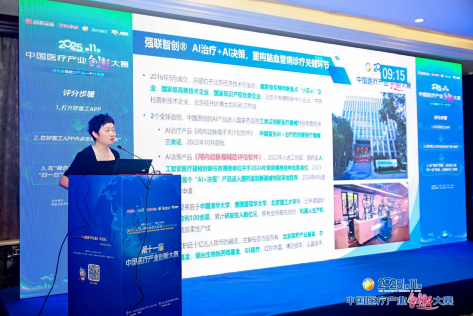 2025年10月17日至20日,在第十个“国际临床工程日” 来临之际,由国际临床工程联盟(GCEA)、《中国医疗设备》杂志社、美国医疗器械促进协会(AAMI)等机构共同主办的第六届国际临床工程与医疗技术管理大会暨第十届“国际临床工程日”全球学术大会在深圳隆重召开。本届大会以“创新全球医疗科技,增进人类健康福祉”为主题,吸引了来自全球110多个国家的专家学者、商会代表及行业精英共同出席,线上线下参会人数超过万人次,充分展现了全球临床工程领域的高关注度与中国在其中的重要地位。 在大会重要分论坛——“中国好医工论坛”上,强联智创®携手首都医科大学宣武医院医学工程处高级工程师李东教授联合进行了专题演讲,主题为《未来已来——用AI重构脑血管病诊疗的关键环节》。演讲中,李东教授展示了AI在脑血管病诊疗中的系统化应用成果:通过AI算法优化术前影像分析流程,实现病变识别与风险预测自动化;在术中辅助决策环节中,实现导管路径智能规划与风险提示;在院企联合转化项目中,探索AI如何在多中心临床实践中形成标准化与可复制的诊疗路径。该主题报告引发了在场专家的广泛关注与热烈讨论,为青年医工与临床医生提供了可直接参考的AI技术临床落地经验,并进一步彰显了中国企业在全球脑血管病智能诊疗领域的引领实力。 10月18日,在大会同期举办的第十一届中国医疗产业创新大赛决赛中,强联智创®创始人、董事长兼总经理秦岚女士代表公司登台参赛,展示了企业自主研发的“颅内动脉瘤辅助评估软件”这一创新成果。 该产品凭借在“AI+决策”方向的突破性应用,从200余个项目中脱颖而出,荣获“最具投资价值奖(企业组)”第四名。作为强联智创®AI+决策体系的核心产品之一,评估软件面向“是否需要手术治疗”的临床关键决策问题,通过综合患者的基础信息、既往病史、家族史、影像学及功能学参数,精准预测颅内动脉瘤的稳定性,为医生提供科学的治疗建议。如果系统判断动脉瘤稳定性较好,医生可采取保守随访方案;若稳定性较差,则建议及时手术干预,以降低中风风险。早在2022年即入选工信部与国家药监局联合发布的人工智能医疗器械创新任务揭榜挂帅名单,并于2024年荣获揭榜挂帅优胜单位。2024年,该产品成为全国首个进入国家药监局创新医疗器械特别审批程序的“AI+决策”产品。 同时,凭借在推动脑血管病智能诊疗、助力医疗公平与患者公益方面的突出贡献,强联智创®荣获“2025年度中国医疗产业社会责任爱心企业”称号。这一荣誉充分肯定了企业在科技创新与社会责任并重方面的长期努力,也展现了其以科技赋能临床、以智能守护生命的使命担当。 作为中国行业领先的专注于脑血管病智能诊疗领域的创新企业,强联智创®受邀亮相本届盛会,全面展示了包括“AI导管塑形机器人家族”在内的一系列原创技术成果,与全球医工同行共同探讨AI技术在医疗健康领域的创新应用与产业化路径。展会期间,多位国内外医疗机构代表、临床工程专家到访展台,就AI技术在神经介入诊疗领域的应用前景和合作模式进行了深入交流。展会不仅展示了中国医疗科技企业在技术创新与产业转化方面的硬实力,也传递出国产高端医疗装备向智能化、国际化发展的坚定信心。强联智创®的亮相与参与,体现了中国企业在全球脑血管病诊疗领域不断增强的话语权与技术影响力。 从“中国好医工”到“世界好医工”,从国内创新大赛到国际学术盛会,强联智创®始终秉持“让导管自动认路,让医生更专注治疗”的使命,坚持科研创新与临床需求深度融合。此次参会与获奖,不仅是对公司技术创新实力的肯定,更标志着强联智创®在国际舞台上持续拓展的步伐。未来,强联智创®将继续携手国内外医疗专家,共建智慧医疗生态体系,助力中国医疗科技以创新姿态走向世界,以AI赋能健康未来。 关于强联智创®       强联智创(北京)科技有限公司(以下简称“强联智创®”)成立于2016年9月,位于北京市北京经济技术开发区,是专注于脑血管病智能诊疗领域的行业龙头企业,致力于打造AI驱动的新一代神经介入“全自动驾驶”解决方案,通过AI治疗+AI决策的方式提供软硬件结合的整体解决方案,解决临床诊疗中的卡脖子难题,覆盖国家神经疾病中心、省市级重点医院及基层医院;同时,基于公司自主知识产权的脑血管病智能诊疗服务平台,为上亿脑血管病潜在患者及高危人群提供健康科普、筛查、体检及随访等服务。强联智创®是国家高新技术企业、国家专精特新“小巨人”企业、国家知识产权优势企业,2023年上榜胡润全球猎豹企业。       强联智创®长期与国家神经疾病中心开展紧密的医工结合,联合进行中国原创、国际首创的产品研发,技术水平和自主研发能力行业领先。参与和承担国家级和省市级重大课题10余项,已申请各项专利100余项,已授权的PCT及发明专利50余项。公司以“AI赋能医疗,科技呵护生命”为使命,致力于用AI治疗+AI决策重构脑血管病诊疗的关键环节。在治疗端,形成以AI内核为驱动的新一代“全自动驾驶”整体解决方案 —— 【颅内动脉瘤手术智能化解决方案】,属于中国原创、全球首创的颠覆式创新产品,开创AI辅助神经介入手术治疗的先河,填补国际空白。其中的核心AI软件【UKnow®颅内动脉瘤手术计划软件】是中国第一张AI治