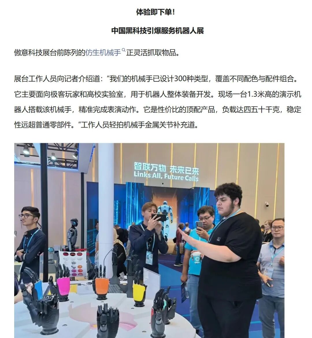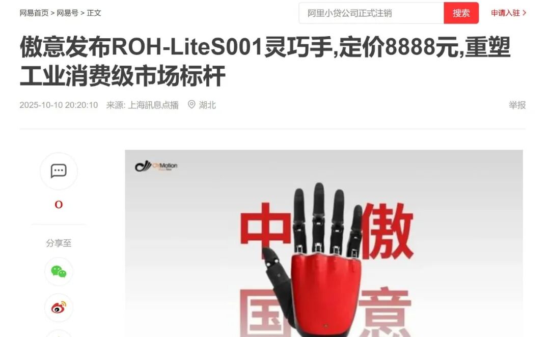 网易新闻、华东财经网等媒体则重点关注到傲意科技最新全面发售的 ROH - LiteS001 灵巧手,对产品性能市场影响进行了深度披露。