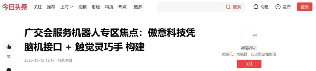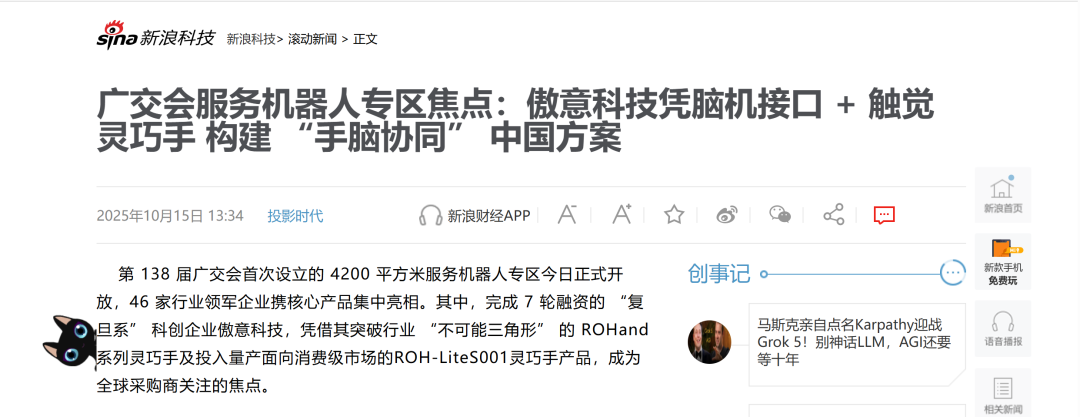 新浪科技、腾讯科技等网媒刊文报道:“广交会服务机器人专区焦点:傲意科技凭脑机接口 + 触觉灵巧手 构建 ‘手脑协同’ 中国方案”。