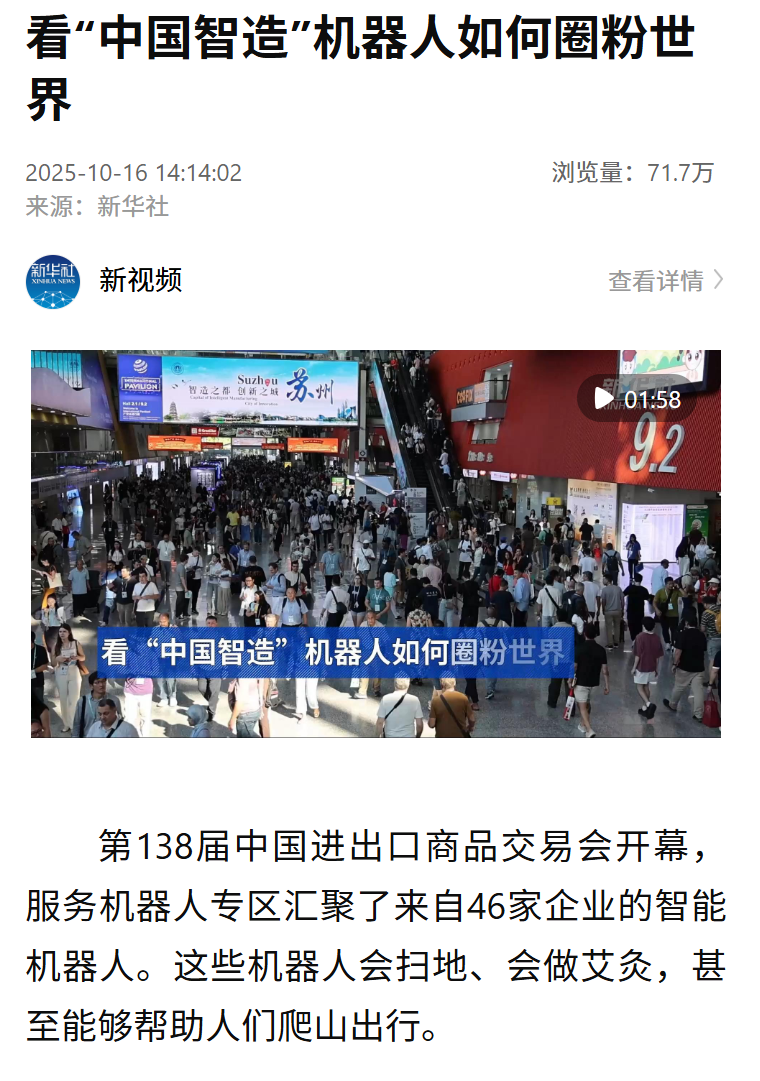 新华社刊发 “看‘中国智造’机器人如何圈粉世界” 系列报道,相关报道总集获超100W+关注