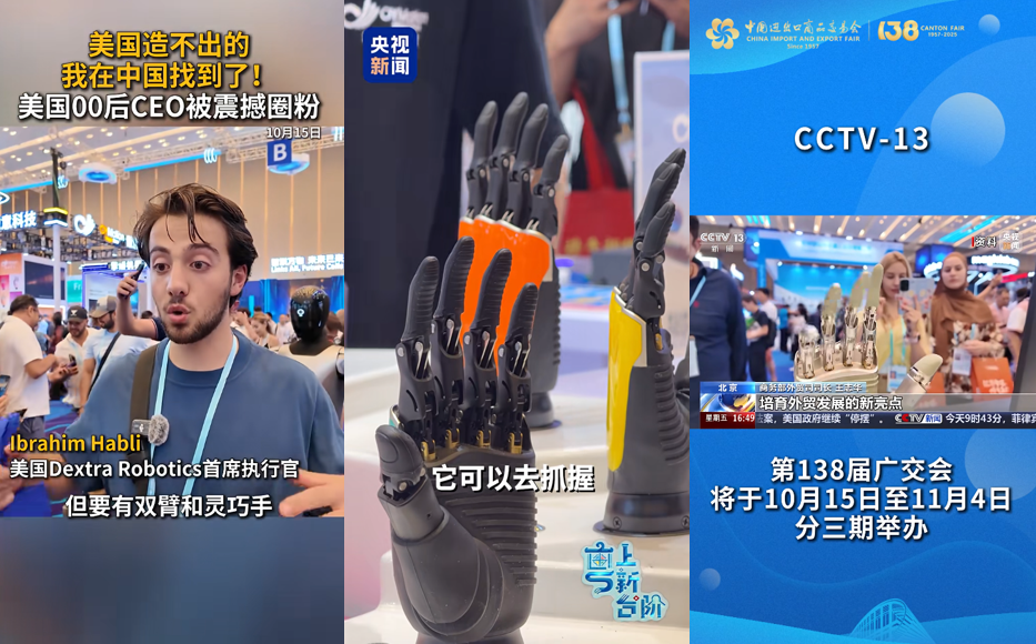 央视新闻联播推出 #粤上新台阶 视频专题,聚焦广交会贸易现场,傲意科技以“手”为媒介,和全球采购商握手,向外商自信展示中国智造实力和产品创新,大大方方谈生意