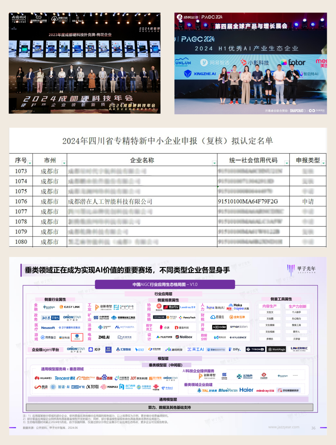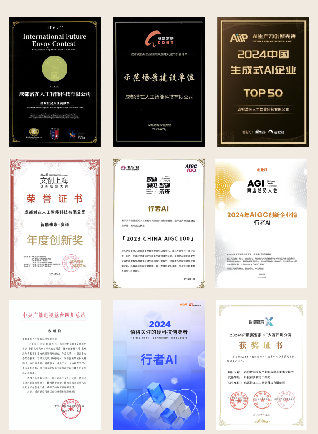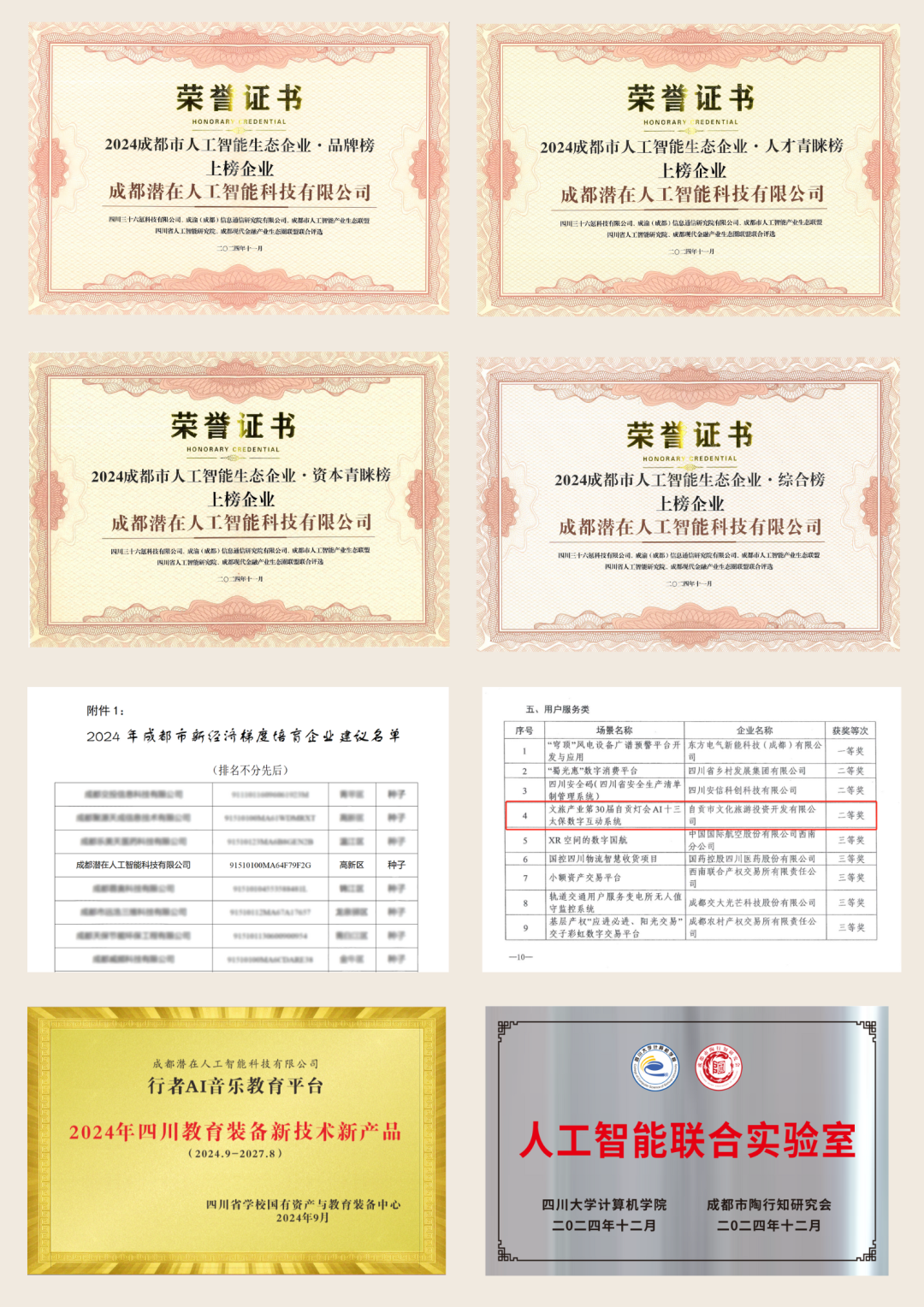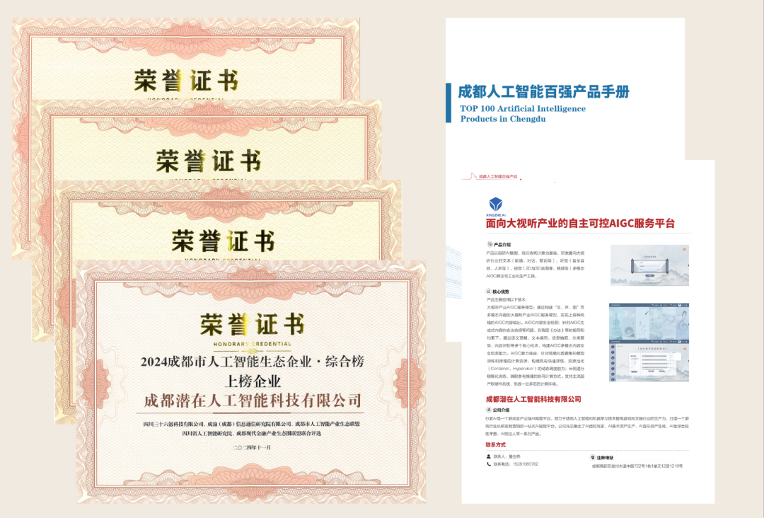 11月12日,我司凭借凭借卓越的技术实力、在人工智能领域的创新能力和突出表现,品牌效力、资本热度及人才吸引力荣登“成都市人工智能生态企业榜(2024)”综合榜、品牌榜、资本青睐榜和人才青睐榜“四个榜单,旗下“面向大视听产业的自主可控AIGC服务平台”凭借实力入选《2024 年成都市人工智能百强产品》,“AI+面向数字文娱产业的多模态垂类大模型应用”被选入成都市人工智能+应用案例集。坚定了我们继续深耕人工智能技术,推动“面向大视听产业的自主可控AIGC平台”健康发展,为数字文娱产业提供更多创新解决方案的决心。