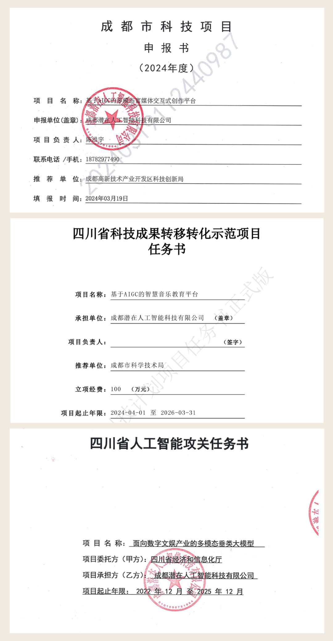 5月27日,行者AI项目《基于AIGC的多模态富媒体交互式创作平台》上榜成都市科学技术局—2024年度重点支撑计划成果转化项目,2024年成都市第三批重点研发项目,并由成都市科学技术局下发申报书。
