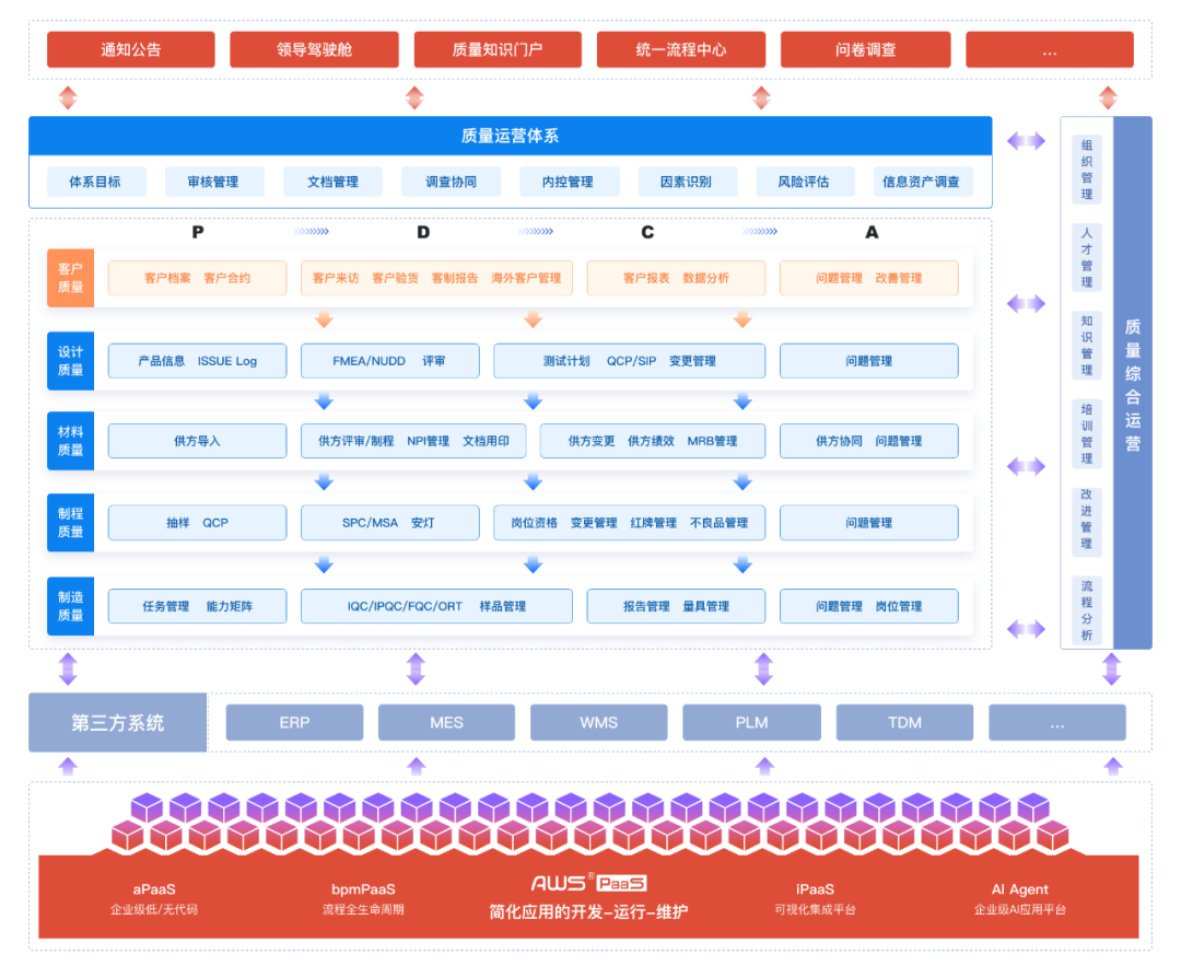 依托AWS PaaS平台的低代码与BPM能力,横向打通研发、供方、生产、质检、销售等环节,确保信息实时共享与高效协同;纵向贯通集团、事业部/工厂至供应商的质量信息链,实现生产规范化与过程可视化。 基于AWS PaaS的QMS系统架构