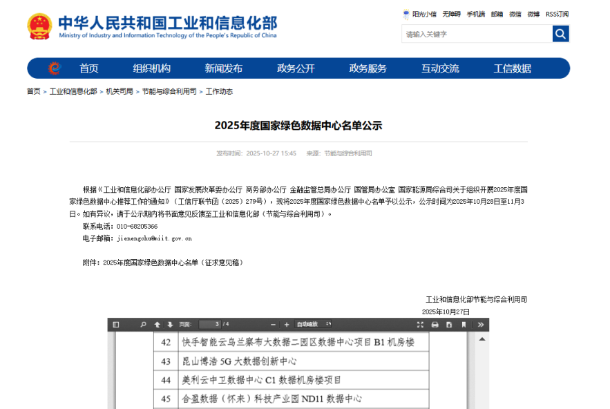 合盈数据(怀来)科技产业园数据中心项目获2025年度国家绿色数据中心