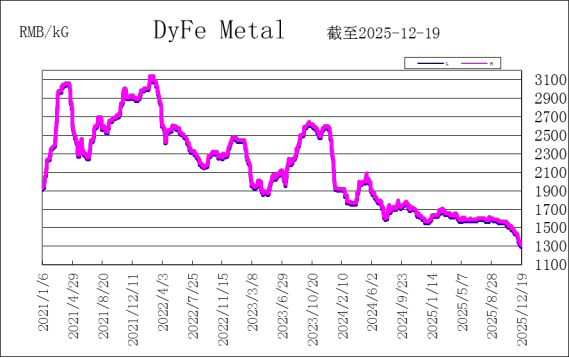 镨钕金属因下游磁材厂主要以消耗库存补充正常生产原料为主,成交价格和量不理想,拉低市场预期,部分持货商年底套现,压价出货,价格走低。