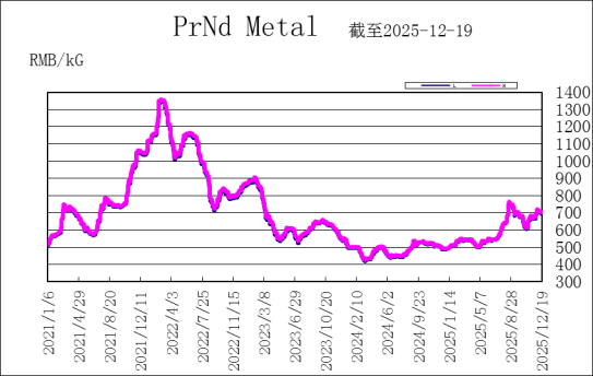 12月19日亚洲金属网价格:镨钕金属价格697-702元/kg;金属钕价格710-715元/kg;镝铁合金价格1290-1310元/kg;金属铽价格7750-7850元/kg。