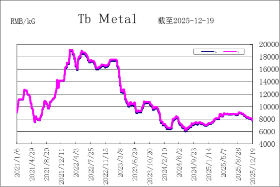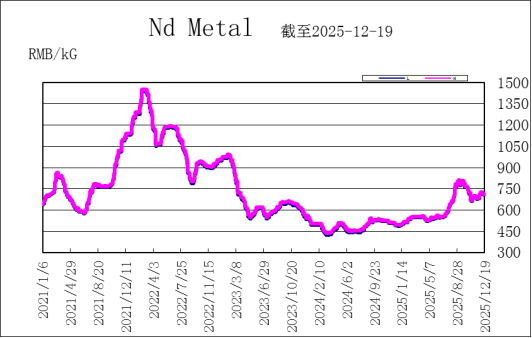 Asia Metal prices on December 19: PrNd metal price is 697-702 RMB/KG, Nd metal is 710-715 RMB/KG; DyFe alloy is 1,290-1,310 RMB/KG and Tb metal is 7,750-7,850 RMB/KG.