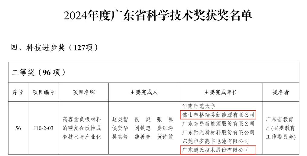 近日,2024年度广东省科学技术奖揭晓,道氏技术及其子公司格瑞芬新能源参与完成的“高容量负极材料的碳复合改性成套技术与产业化”项目,荣获「科技进步奖二等奖」! 「广东省科学技术奖」由广东省人民政府批准颁发,采用了严格的定标定额评审制度,是衡量省内企业创新水准的权威标尺。此次获奖,标志着道氏技术在高容量负极材料的技术研发与产业化方面的成果受到了官方高度认可,也坚定了道氏技术全力向“固态电池全材料解决方案供应商”目标奋进的信心。 荣誉背后是坚实的技术积累。目前,道氏技术的硅碳负极与单壁碳纳米管两大负极材料产品已具备显著的竞争优势: 硅碳负极:具有首效高、膨胀低、寿命长等特点,已与众多企业开展评测和送样合作,其中部分客户已实现批量出货。年产1000吨硅碳负极项目也正积极推进落地,产业化进程加速。 单壁碳纳米管:粉体产品性能如纯度、比表、G/D值等关键指标上已比肩进口产品;浆料产品采用自研分散剂,在粘度、固含量等指标上亦优于进口产品。值得一提的是,道氏研发团队已攻克单壁碳纳米管低成本规模化制备技术,且基地具备连续化生产能力,产能扩容正有序推进。 2025欧洲电池展上的道氏技术碳材料产品 未来,道氏技术将持续聚焦新能源电池材料迭代技术和前沿产品,不断朝着“固态电池全材料解决方案提供商”的目标迈进,同时积极拥抱AI时代机遇,着力打造和深化“AI+材料”创新平台,在能源革命浪潮中迸发出更澎湃的创新能量!
