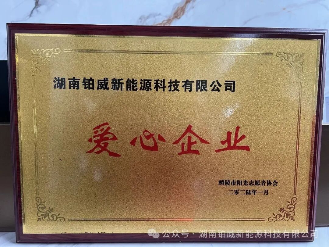 作为新能源领域的责任企业,铂威新能源始终秉持“以科技赋能绿色,以公益传递温暖”的理念。此次活动中,我们积极参与捐助,为福利院儿童、贫困学生送去关怀与支持,并凭借长期以来的公益实践,荣获醴陵市阳光志愿者协会颁发的“爱心企业”牌匾。这份沉甸甸的荣誉,是认可,更是我们继续前行的动力。