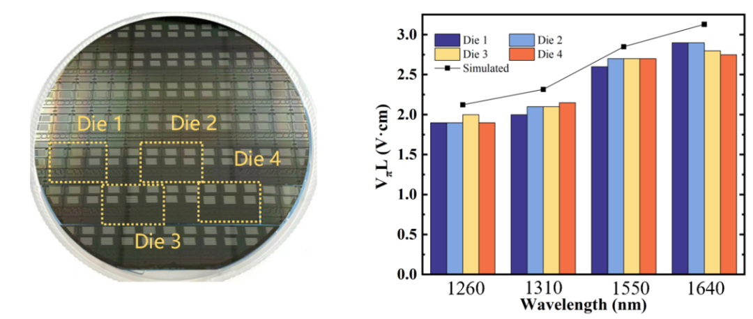 图2 四个芯片上器件在不同波长下的调制效率测试结果(折线为模拟计算值)