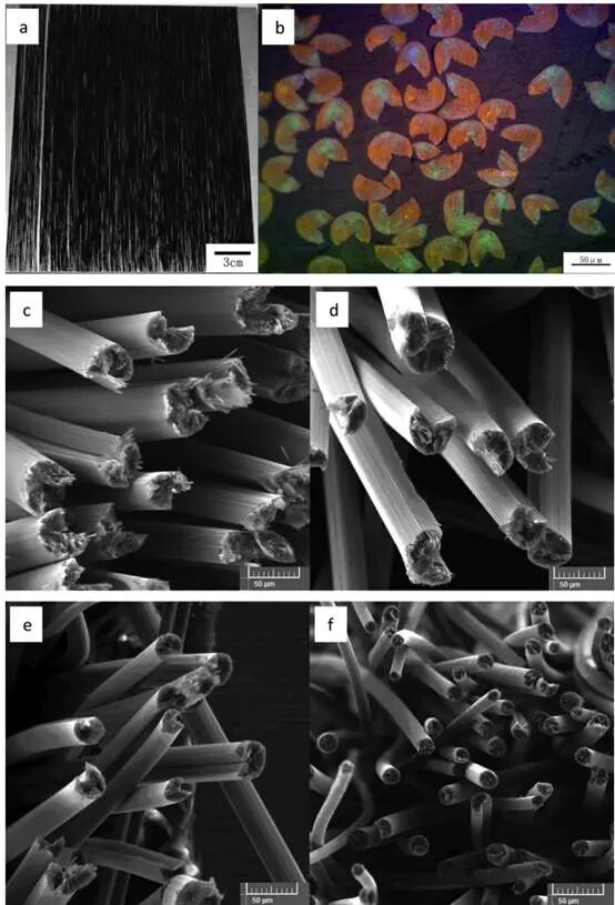 图1.(a)平板上排列整齐的沥青纤维的光学照片,(b)典型的偏光显微镜照片以及(c-f)不同直径(b、c为50-55毫米,d为28-32毫米,e为18-22毫米,f为10-15毫米)的2500°C石墨化MPGF的扫描电子显微镜图像。