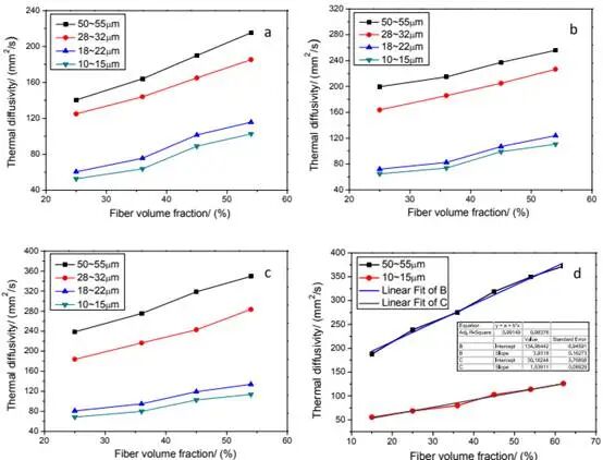 图5. 一维MPGF/ABS树脂复合材料沿纤维纵向的热扩散系数随纤维体积分数、直径和石墨化温度的变化(a)2500℃,(b)2700℃,(c)2900℃,(d)线性拟合曲线。