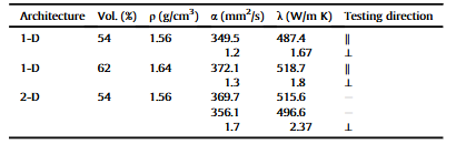 热扩散系数(α)和导热系数(λ)随Vf、直径和石墨化温度线性增加。例如,Vf=62%的1-D复合材料(2900°C石墨化,直径50-55 μm):