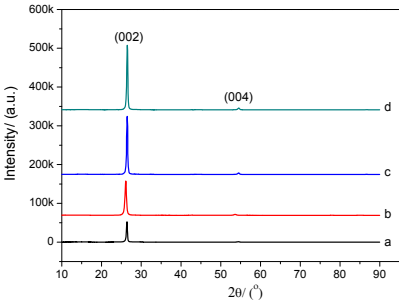 图3. 不同直径(a-10-15、b-18-22、c-28-32、d-50-55毫米)的2500°C石墨化MPGF的XRD图谱。
