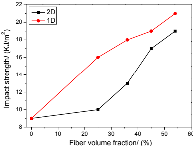 图8. 1-D和2-D MPGF/ABS树脂复合材料的冲击强度与直径为50-55毫米的2500°C石墨化纤维体积分数的关系。