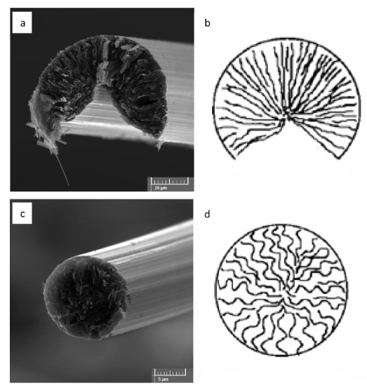 图4. 在2900°C下石墨化的单根圆形碳纤维的典型SEM图像,其中(a)为大直径,(c)为小直径,以及其相应的横向结构示意图(b和d)。