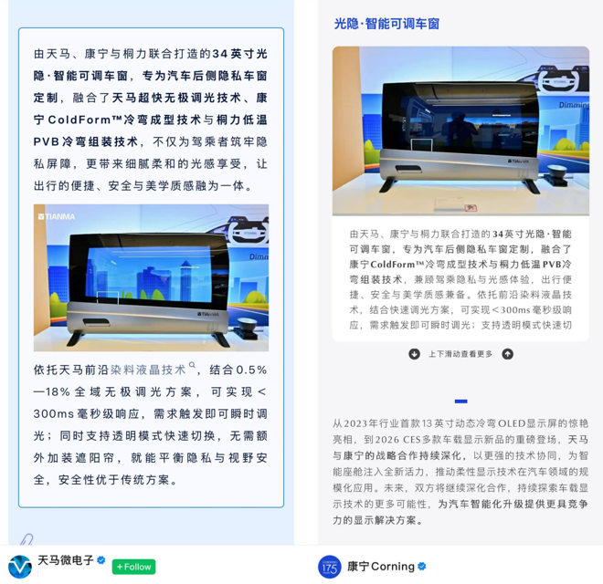 AI算力加速落地,汽车正从交通工具演变为移动智能体与算力节点;“光储充显”一体化让光伏、储能、充电与显示融入通勤日常;电动摩托与新能源大巴成为户外显示的重要载体;钙钛矿推动建筑幕墙玻璃迈向发电与调光协同。能源与信息在同一界面上叠加,对光学贴合材料提出了更高要求——隔绝紫外与红外、高粘接强度、耐高低温循环与良好散热能力。 LTVB正是在这一背景下,由桐力实验室历时三年研发形成的成果,已具备批量生产能力并完成多场景验证。就在不久前的CES展上,天马微电子与康宁公司联合桐力光电基于LTVB新技术在拉斯维加斯联合展示的变色车窗方案(上图是天马微和康宁公司分别针对LTVB材料全贴合智慧车窗调光技术的新闻发布),也成为相关技术迈向产业化的重要里程碑。 今早,随着开工大吉的声声爆竹声,LTVB正式面向行业发售,顺应“车身发电、车载与户外显示、幕墙光伏与调光玻璃”的融合大趋势,桐力愿与产业链伙伴共同推广更高可靠性的光学全贴合解决方案。关于LTVB的结构设计与性能优势,工艺路径及后续的合作方案,桐力新材料事业部将在后续篇章中持续展开,我们期待着与汽车行业、建筑行业、AI领域及显示产业链围绕这款新材料的全面战略合作。