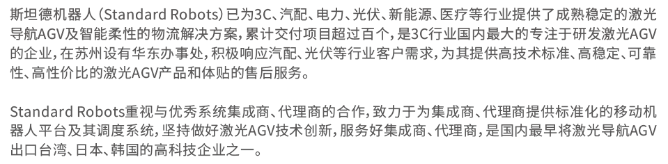 斯坦德机器人是一个工业移动机器人柔性物流服务商,专注于工业级移动机器人的研发与生产,实现了从机器人底层定位算法、操作系统、控制器等核心元素的自主研发全覆盖,主要产品为激光导航AGV及其调度系统。斯坦德机器人(Standard Robots)致力于为优秀的系统集成商及终端制造工厂寻找标准化、可复制的算法应用场景,实现其柔性化、敏捷化的厂内物流需求,为客户践行轻资产、回报快的初期物流投入,为行业构建信息化、数据化的物流基础设施,是全球真正践行把激光导航AGV应用于华为、中兴、富士康等实际工业物流领域的高科技企业。