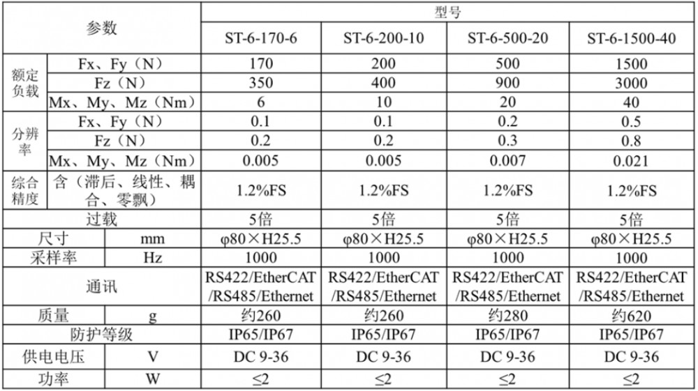 该系列传感器为工业级多维力传感器,提供5倍过载能力,内置低噪声放大器,综合精度优于1.2%
