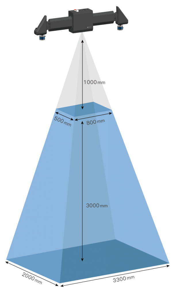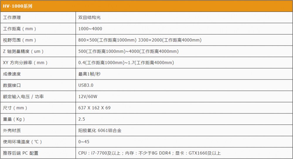 HV1000系列大视野3D相机,在4米的工作距离下,视野范围可达3.3m*2m,Z轴测量精度为4mm;在1米的工作距离下,视野范围可达0.8m*0.5m,Z轴精度可达0.5mm,可以实现大范围的精度识别和定位。