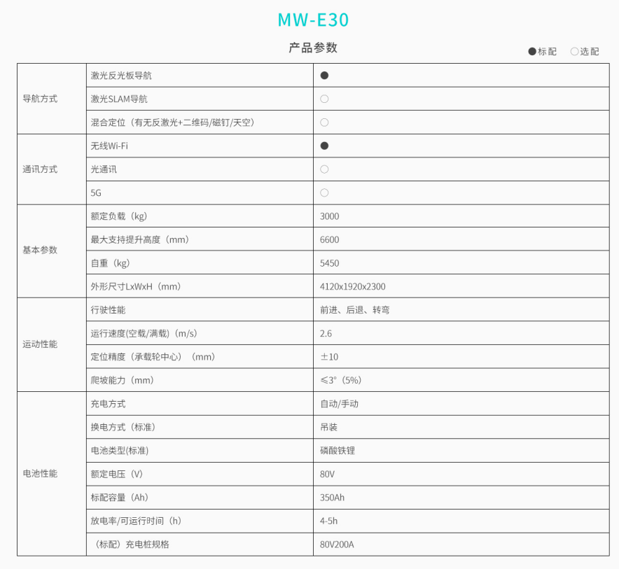 平衡重式无人叉车MW-E30,货叉在前轮中心线外。主要特点是为了克服货物产生的倾覆力,叉车在后部装有配重,作业速度比较快。广泛应用于工厂车间、仓库、配送中心和配送中心的码垛作业。