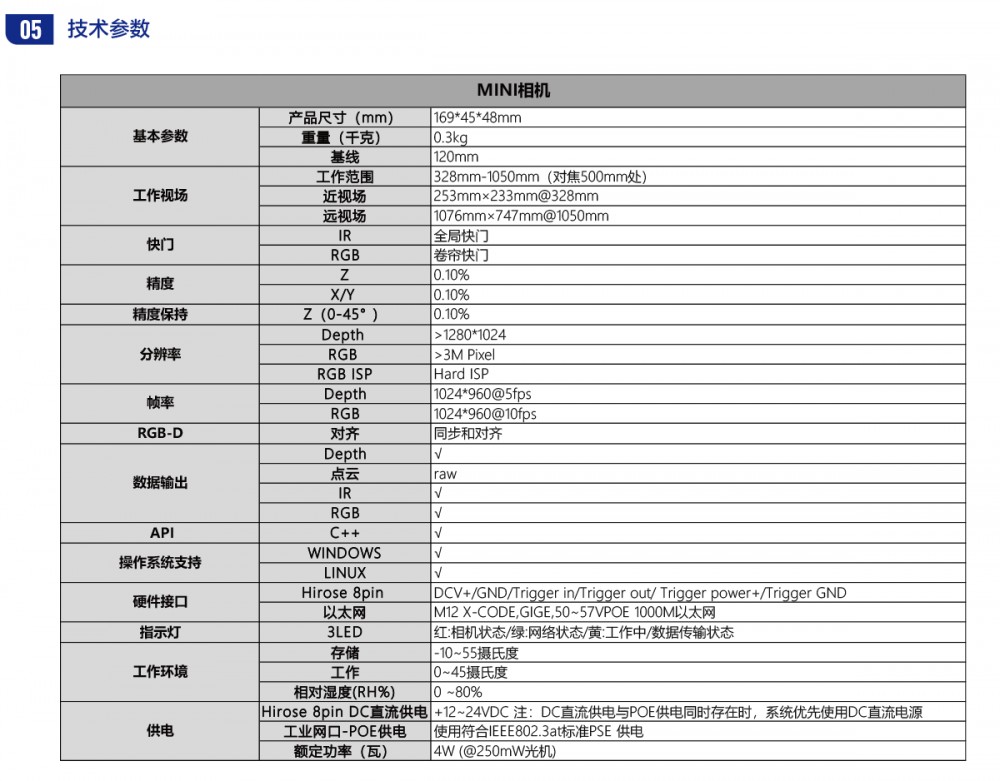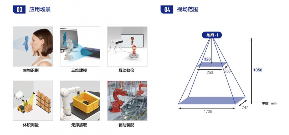 Ainstec 3D相机拥有超小体积和超低功耗,携带和部署简单易用。该相机用三维的方式去观察,理解所见场景,将物理三维世界转换成数字三维世界。可根据应用端的需求进行定制,相机基于MEMS动态结构光,包含2个IR相机,1个RGB相机,1个MEMS结构光投射器,内嵌计算芯片,无需借助上位机即可完成三维重构,能快速准确输出亚毫米级精度的深度图,点云图,同时具备边缘计算能力,用于深度训练,直接输出应用结果,可适用于物体深度数据采集,工业检测,机器引导等