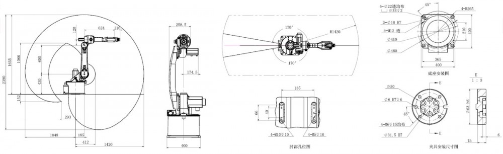 紧凑的机械设计, 节省安装空间。采用中空臂、内部走线设计, 大幅度减少了线缆外置所造成的手腕运动空间干扰和线缆磨损及喷溅损坏。
