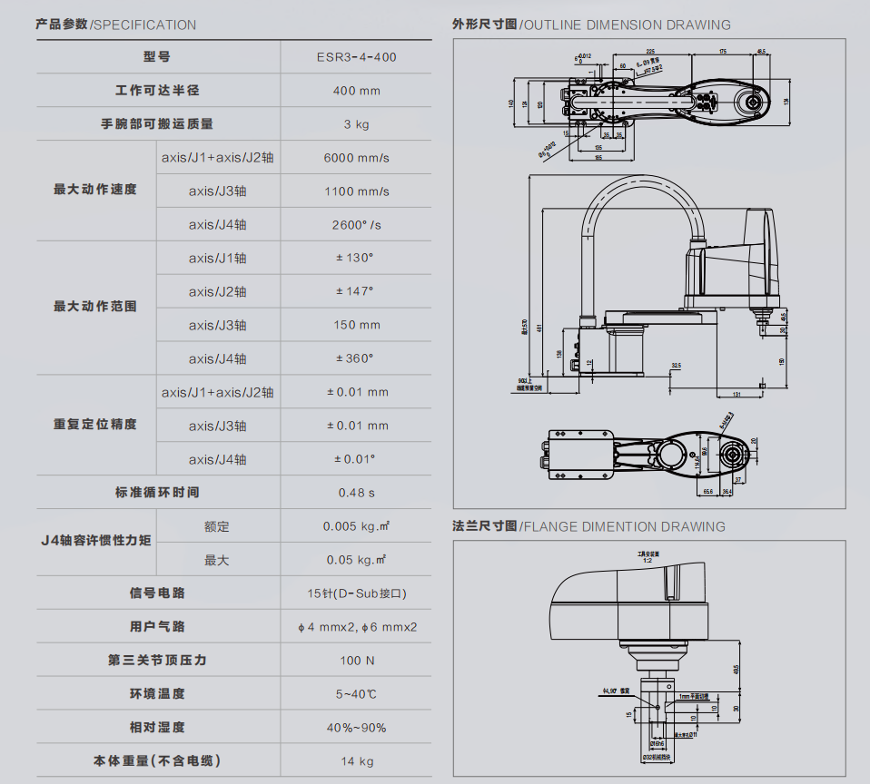 ESR3-4-400是一款Scara机器人,手腕部可搬运质量3 kg,工作可达半径400 mm。