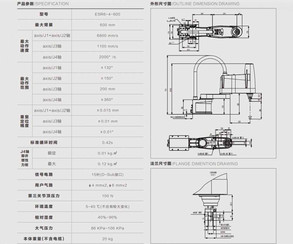 ESR6-4-600型工业机器人,负载能力为6kg,工作范围为600mm。