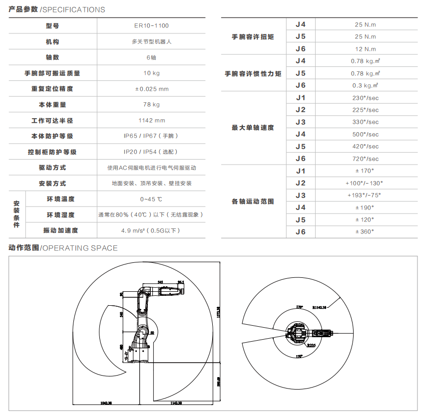 ER10-1100是重载桌面系列中的一款机器人,手腕部可搬运质量10 kg,工作可达半径1142 mm。