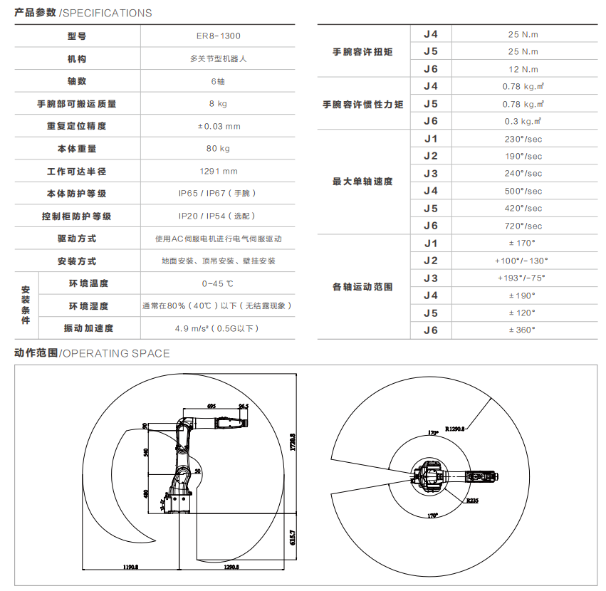 ER8-1300是重载桌面系列中的一款机器人,手腕部可搬运质量8 kg,工作可达半径1291 mm。