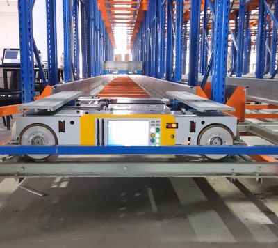用于由贯通货架延伸而成的高密度存储货架系统,通过无线遥控的智能小车,可在货架系统设定的轨道上进行前后移动和升降运动,从而将托盘货物逐个移至指定位置,再由其他取货装置货物取走,从而实现货物的进出和存取。 穿梭板设备占用空间小,存储效率高,取放货物方便,投资小,自动化和信息化程度高。