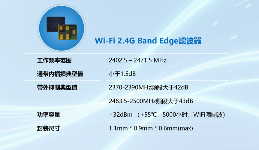 Wi-Fi 2.4G频段相关通信产品进入各国市场都必须经过严格认证。例如中国SRRC和美国FCC认证,这两大权威认证均对Wi-Fi 2.4G频段的边带杂散制定了严格的标准,SRRC对Wi-Fi 2.4G产品的高信道边带(2483.5-2500MHz)杂散要求为-40dBm/MHz;FCC对该边带杂散的要求为-42dBm/MHz。 为了应对无线频率合规对边带杂散的高要求,众多客户不得不降低发射功率,导致产品无线通信距离缩短,用户体验和产品竞争力大打折扣,特别是在无人机和运动相机市场。 为有效解决无人机和运动相机等市场产品中Wi-Fi 2.4G频段边带杂散问题,推动产品顺利通过FCC认证,并提升用户体验感,武汉敏声全新研发并量产Wi-Fi 2.4G Band Edge滤波器。