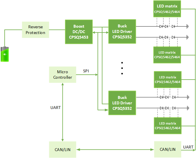 早在今年4月,易冲半导体公众号文章《执剑破局:新关税形势下的汽车LED驱动全国产替代方案》中,提到车规半导体可能遇到的涨价潮。时至8月,某国际大厂正式启动了新一轮大规模涨价,这一轮调价的规模堪称史上最大,涉及的料号超过6万个。其中,汽车电子成为涨价主力,上文中所提到的多通道LED矩阵控制器在此轮调价中普遍上调25%-32%。此轮调价可能引发连锁反应,其他国际大厂也可能跟进调价,下游企业或许会加速库存消化并调整供应链。 在此关键时刻,易冲半导体推出的CPSQ5462和CPSQ5464系列产品, 适用于ADB车灯应用,提供12通道或16通道的矩阵控制。在硬件和软件上,和国际竞品兼容设计,硬核替代TI TPS9266X当前的12通道或16通道系列。客户侧已成功验证,可显著缩短国产替代周期,大幅降低成本。 易冲半导体长期坚持自主研发,开发适应中国市场的产品,车灯LED驱动产品晶圆与封测制造全过程均于中国大陆境内完成。易冲车灯LED驱动芯片产品现已全面投向市场,量产验证性能媲美国外竞品,同时硬件和软件高度兼容。在跛行模式、电流精度等国外产品应用痛点上大力创新,性能全面超越国外对标产品,极大地简化国产化方案验证开发过程,助力安全保供。易冲半导体是目前国内具有规模上车量产数据的智能前大灯驱动芯片供应商之一,还将继续在汽车前灯与尾灯LED驱动芯片上持续加大研发投入,为国内汽车行业迈向世界一流、为供应链安全执剑护航。 产品简介 CPSQ5462和CPSQ5464矩阵控制器系列搭配已经量产上车的升压控制器CPSQ5453及降压恒流转换器CPSQ5352, 共同构建高性能、全国产化的车载ADB大灯完整解决方案。 CPSQ5462/4 LED矩阵控制器芯片系列,达到像素级的LED控制,可实现了完全动态的自适应照明解决方案。该系列可提供12/16通道,包括四个子串,每个子串包含三/四个串联的集成开关,各自独立控制单个LED像素,最大支持60V工作电压,最高支持1.5A工作电流。适用于ADB矩阵大灯以及动态的灯语效果 ,如迎宾灯、转向灯等。 产品特点 • 输入电压范围:4.5 V至60 V • CPSQ5464内置16个旁路开关,4组 x 4通道;CPSQ5462内置12个旁路开关:,4组 x 3通道 • 全双工的UART通信接口,可与CAN转换器兼容 • 10位ADC,具有两个多路复用输入 • 内置16MHz振荡器,无需晶振: 仅CPSQ5464 • 可编程10位PWM调光 • LED开路和短路检测及保护 • 支持大输出电容(CPSQ5464) 与竞品的主要功能比较如下: 产品优势 1. 软件和硬件上兼容 CPSQ5462/4拥有完全自主的知识产权,在硬件和软件上做到与竞品兼容,可直接替换。 2.全双工的UART通信 CPSQ5462/4 不仅能够做到UART通信协议与TPS92662A/92664完全兼容,并且能够实现全双工的UART通信,为软件提供更灵活的设计思路。 通信指令实现收发同时进行
