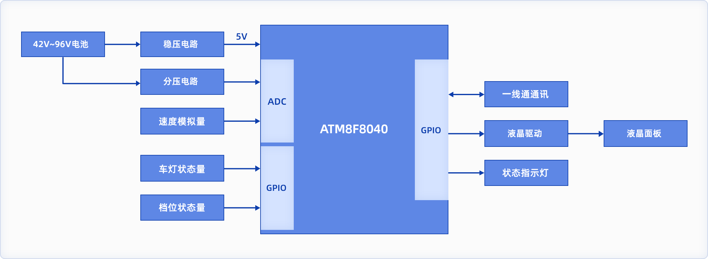 基于自主研发的ATM8F8040芯片,推出高性能高可靠性的仪表盘方案,可广泛应用于电瓶车和摩托车等交通工具的仪表显示。