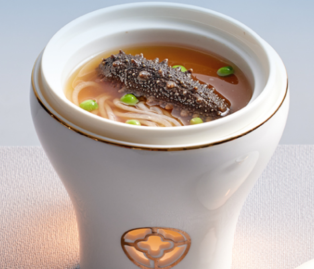 1.海参用高汤煨透待用。西兰花切块、焯水,捞出沥干备用;