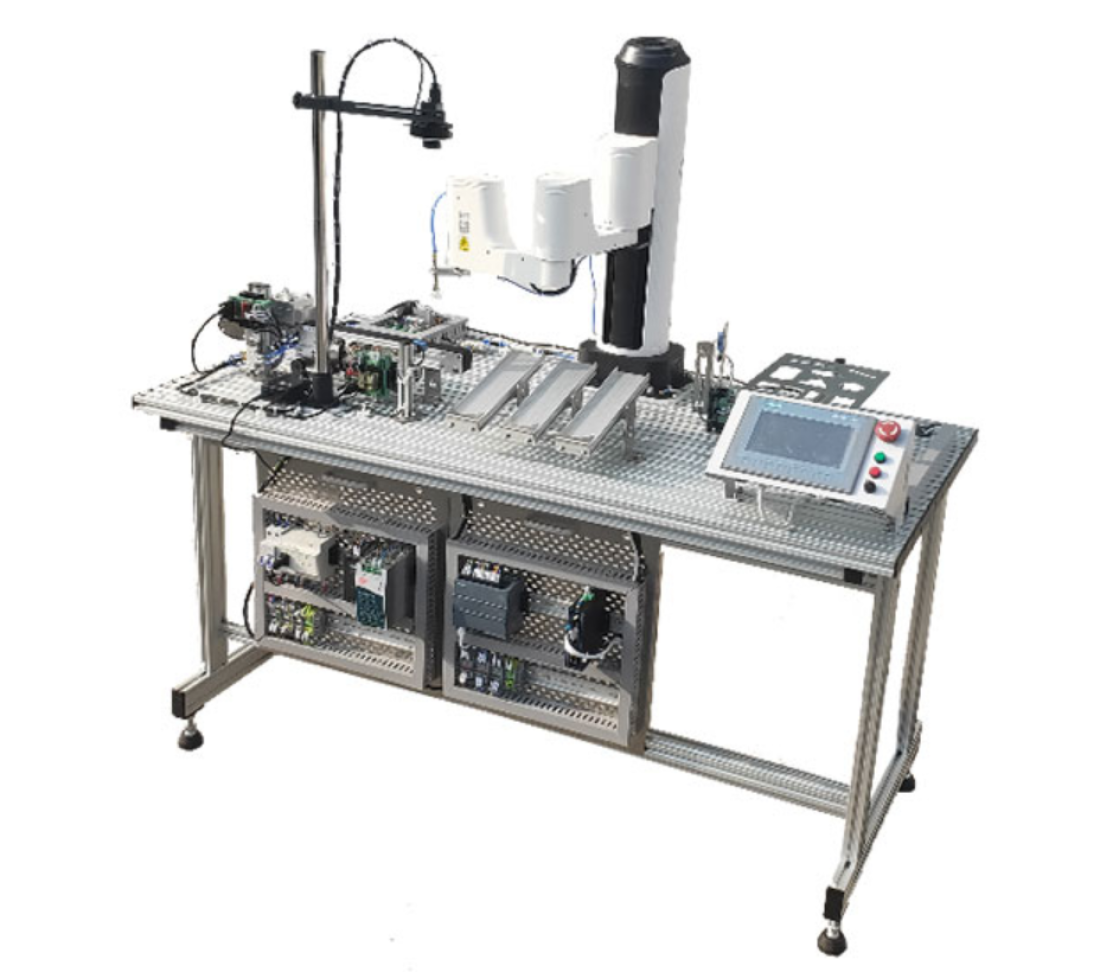 系统主要由SCARA协作机器人单元、智能视觉单元、人脸识别单元、语音识别单元、工业网络单元、供料单元、皮带传送单元、仓储单元、龙门检测单元、PLC单元、HMI人机交互单元等组成。