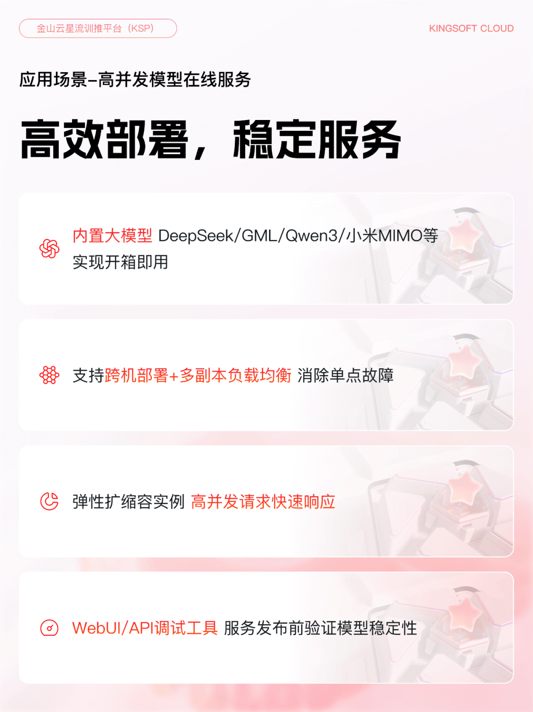 高并发模型在线服务:基于预置/自定义模型跨机部署、多副本弹性扩缩容与冗余设计,突破单机算力瓶颈,实现高并发低延迟响应与高可用服务保障。