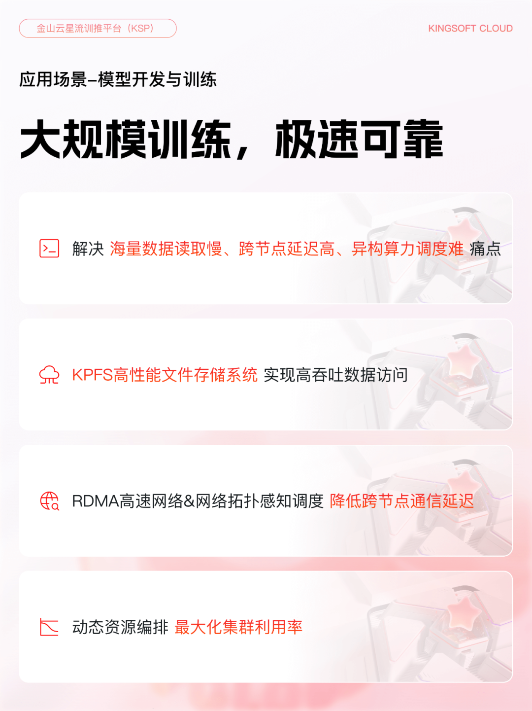 模型开发与训练:通过KPFS高性能文件存储、RDMA网络拓扑调度和动态资源编排,解决海量数据数据加载、跨节点通信及异构算力调度难题,保障分布式训练效率与连续性;