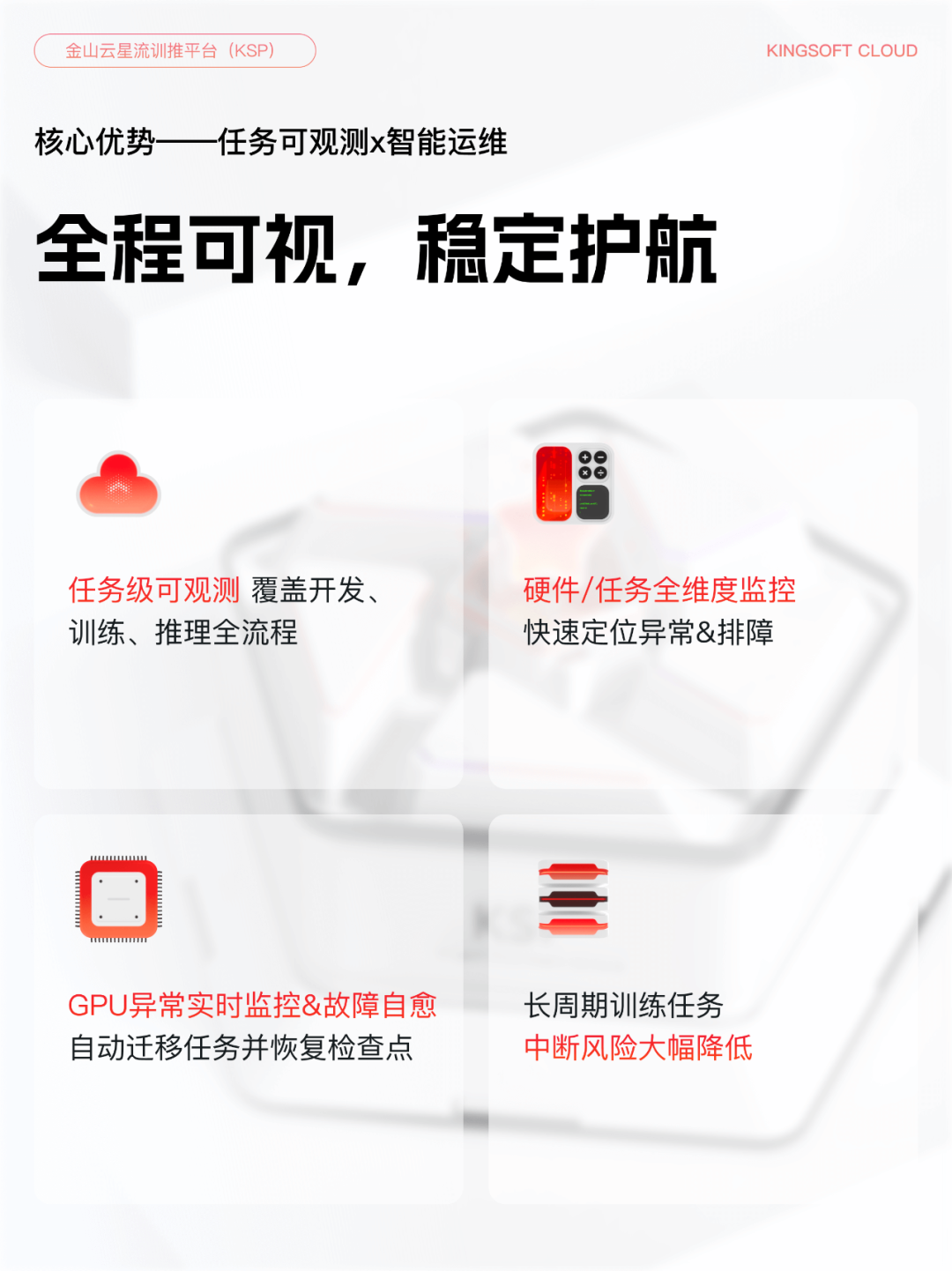 智能运维保障稳定性:GPU故障自愈技术结合任务可观测性设计,实时监控硬件健康状态与任务进程,自动触发故障迁移与任务重调度,降低算力中断风险,保障长周期训练任务稳定运行;