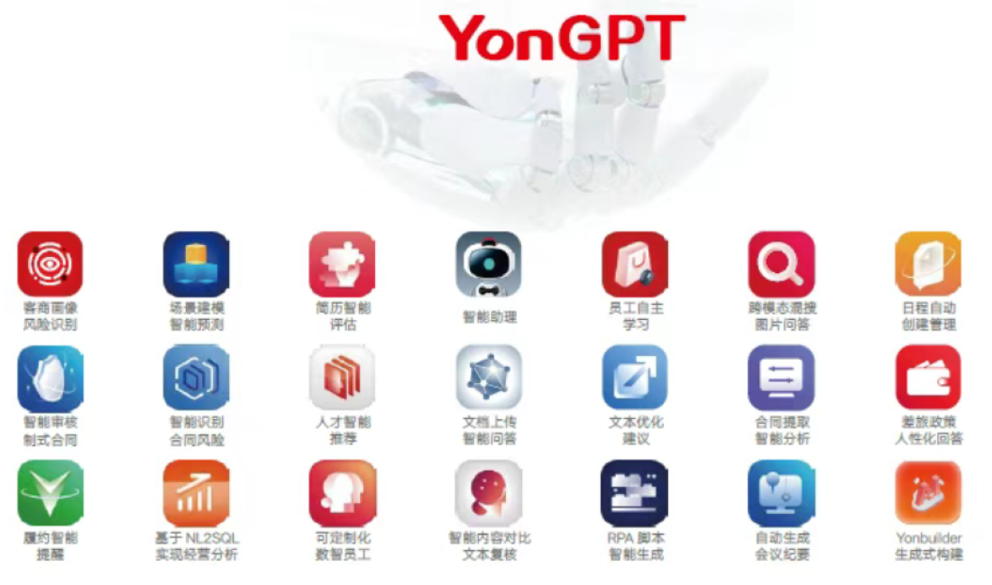 服务大模型不同,YonGPT覆盖财务、人力资源和包括营销、研发、采购、制造、供应链、项目、资产