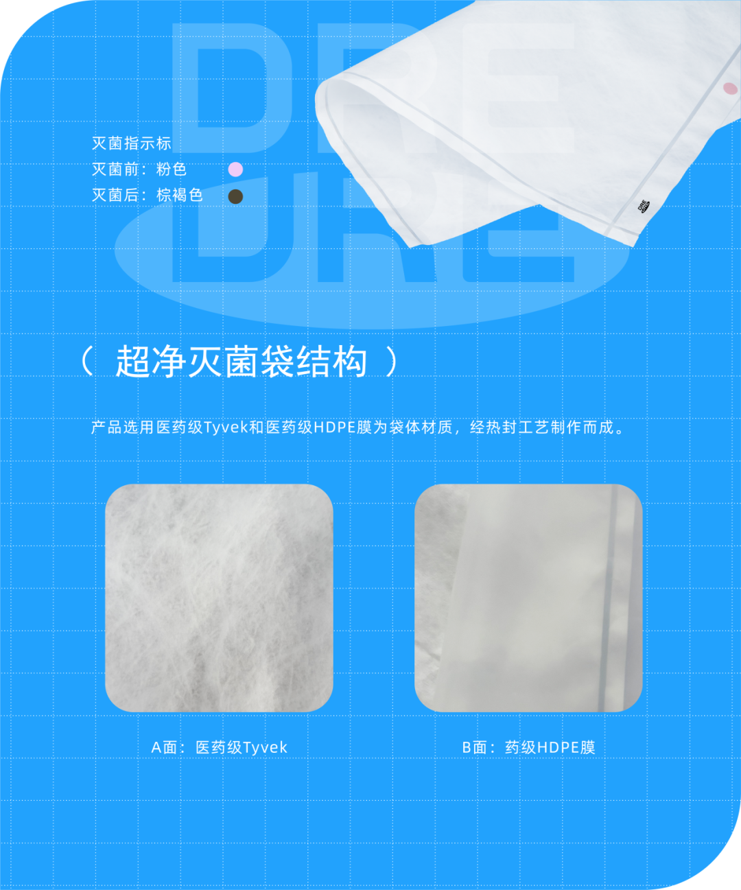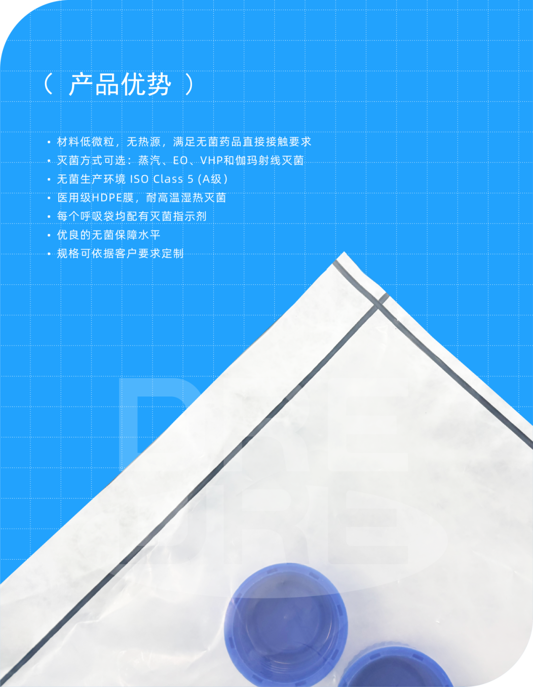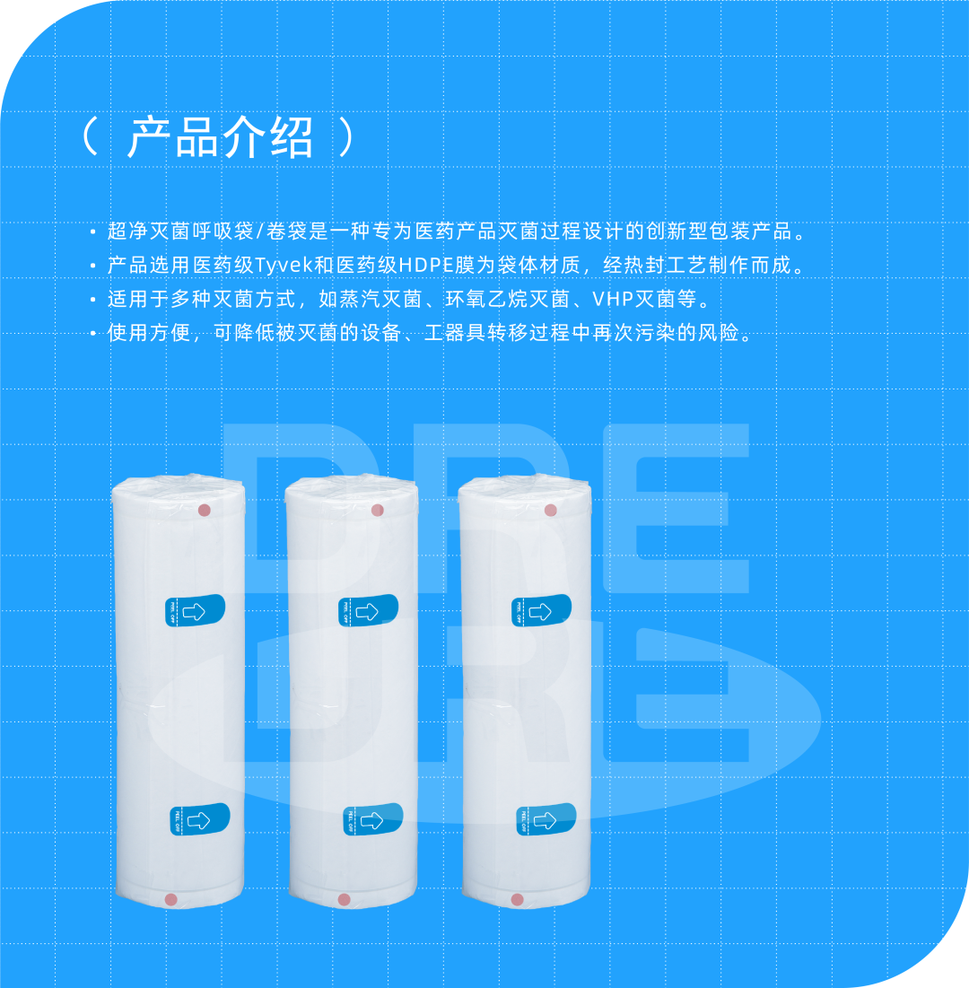 01 产品介绍 超净灭菌呼吸袋/卷袋是一种专为医药产品灭菌过程设计的创新型包装产品。 产品选用医药级Tyvek和医药级HDPE膜为袋体材质,经热封工艺制作而成。 适用于多种灭菌方式,如蒸汽灭菌、环氧乙烷灭菌、VHP灭菌等。 使用方便,可降低被灭菌的设备、工器具转移过程中再次污染的风险。 02 生产环境 尘埃粒子和环境菌水平定期监测。 生产的产品质量稳定,满足客户对产品无菌,无热原、低微粒的要求。 03 产品应用 产品广泛应用于各种领域: 注射系统组件无菌保障 除菌过滤系统配套 不锈钢器具的cGMP级处理 无菌服防护 药用密封组件灭菌管理 超低颗粒物应用 药品容器无菌处理 04 产品结构 产品选用医药级Tyvek和医药级HDPE膜为袋体材质,经热封工艺制作而成。 05 产品优势 材料低微粒,无热源,满足无菌药品直接接触要求 灭菌方式可选:蒸汽、EO、VHP和伽玛射线灭菌 无菌生产环境 ISO Class 5 (A级) 医用级HDPE膜,耐高温湿热灭菌 每个呼吸袋均配有灭菌指示剂 优良的无菌保障水平 规格可依据客户要求定制 06 质量合规 生物相容性符合: - 美国药典 USP<87> - 美国药典 USP <88> 符合美国FDA食品接触法规 (21CFR 177.1520 ) 无人/动物来源(TSE/BSE ) 符合微生物屏障试验要求 07 订购信息